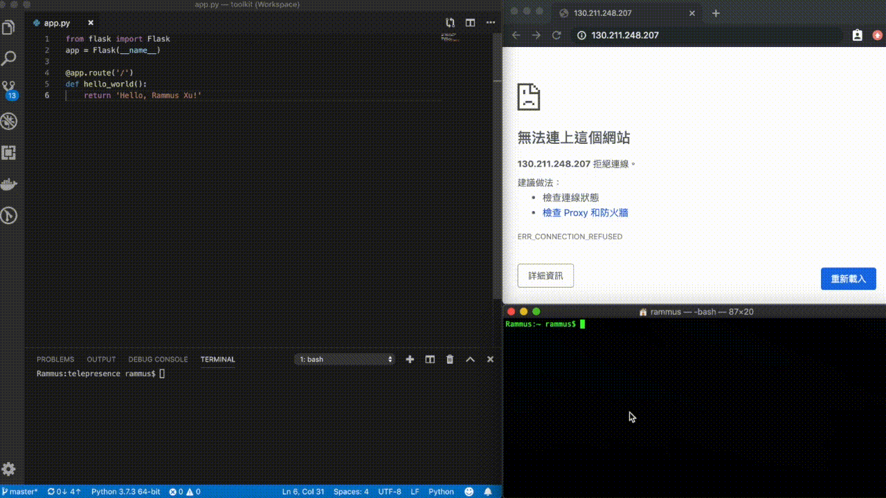 --deployment [deployment-name] 將會置換掉 deployment--expose 5000:80 將 localhost:5000 expose 到 kubernetes-pod:80--namespace [your-namespace] 可以選擇要替換哪個 namespace 的 deployment。預設是 default--run 啟用 server 的方式。ex. npm start, flask run, rails server。這邊帶入 FLASK_DEBUG=1 自動監控 app.py 程式碼變更時重啟 server,如果是別的語言,請自行替換,或是加入環境變數。